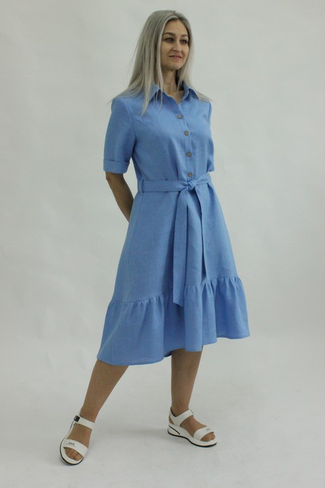 Платье полуприлегающее,отрезное по линии талии с поясом. По лифу рельефы и застёжка с планками. Отложной воротник на стойке. Рукав короткий с отворотом. Низ изделия асимметричный (удлинённая спинка) с воланом. Длина изделия 106 см (по переду)