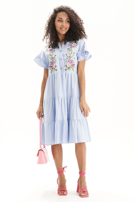 Платье женское с декоративной симметричной вышивкой по полочкам, длиной за колено, трапециевидного свободного силуэта, отрезное по линии талии, со спущенными цельнокроеными рукавами.