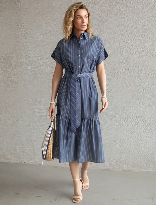 Состав: 100%Хлопок Плотность: 106 Г/м2Платье А-силуэта с поясом серо-синего цвета в тонкую вертикальную полоску выполнено из легкого хлопкового поплина плотностью 106 Г/м2. Воздушное платье с застежкой на пуговицы с пышной юбкой-воланом отличный вариант для теплой и жаркой погоды. Модель обладает красивым кроем, который придает образу женственность и элегантность. Отложной воротничок и короткий цельнокроеный рукав с широкой манжетой создают стильный акцент, подходящий для повседневного ношения и различных ситуаций. Талия подчеркнута поясом, который легко регулируется и подчеркивает силуэт, придавая особый шарм и аккуратность образу. Натуральный состав ткани обладает высокой воздухопроницаемостью, а также способностью поглощать и отдавать влагу. В повседневном платье будет очень комфортно, благодаря правильной регуляции температуры тела. Такая модель подходит на маленький и высокий рост, а так же на любую фигуру, позволяя подчеркнуть достоинства и скрыть возможные недостатки, так же принт в тонкую вертикальную полоску визуально стройнит и вытягивает силуэт. Это длинное платье отлично подойдет тем, кто ценит удобство и утонченность в одежде из качественной вискозы и хлопка. Красивое легкое платье прекрасно подходит для динамичного рабочего дня, городских прогулок или торжественных мероприятий, его легко адаптировать под разные ситуации и стили.