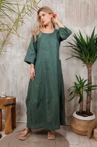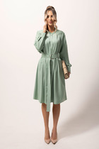 Женственное платье приталенного силуэта. Цельнокроенный рукав длинной 3/4 оканчивается притачной манжетой на сборке. Горловина оформлена отложным воротником на стойке переходящим в планку с застежкой на петли и пуговицы. Модель отрезная по линии талии, присборена на резинку. По бокам функциональные карманы. Низ ровный, без разрезов. Пояс из основного материала входит в комплект.