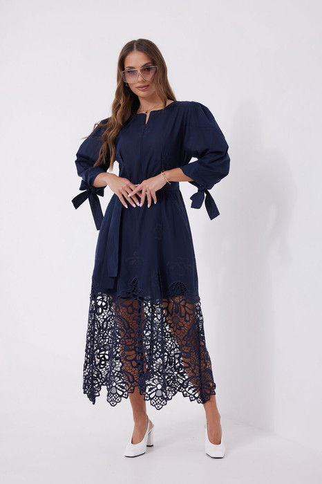 Платье из хлопковой ткани «ришелье». Длина миди. Горловина круглой формы. Застежка по переду на потайную молнию. В боковых швах карманы. Рукав объемной формы с завязывающейся манжетой по низу.  По талии платья складки и широкие шлевки. Талия фиксируется съемным завязывающимся поясом. Платье на подкладке.
