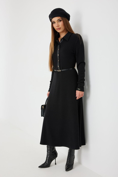 Платье трикотажное прилегающего силуэта длины «макси» расширенное к низу. По талии подрез, нижняя часть платья на подкладке. Втачной рукав полной длины, зауженный к низу. По переду застежка на планку из кожи с кнопками, по горловине отложной воротник.