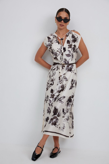 Платье полуприлегающего силуэта чуть расширенное к низу из плательно-блузочной ткани. По линии плеча выполнены разрезы. Горловина со стойкой, переходящей в завязки. По низу боковых швов разрезы. Застежка-молния в среднем шве спинки. Платье на подкладке. Длина 124 см.