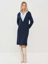 Платье женское полуприлегающего силуэта, зауженное к низу. Перед с декоративными кантами из отделочной ткани из проймы до низа и с вытачками из рельефов. Спинка со средним швом, в котором обработана потайная тесьма-молния и шлица. Также по спинке обработаны талиевые вытачки. Рукав втачной длиной 3/4 фантазийной формы на запах, расширенный к низу, двойной. Обтачен отделочной тканью. Горловина овальной формы.
