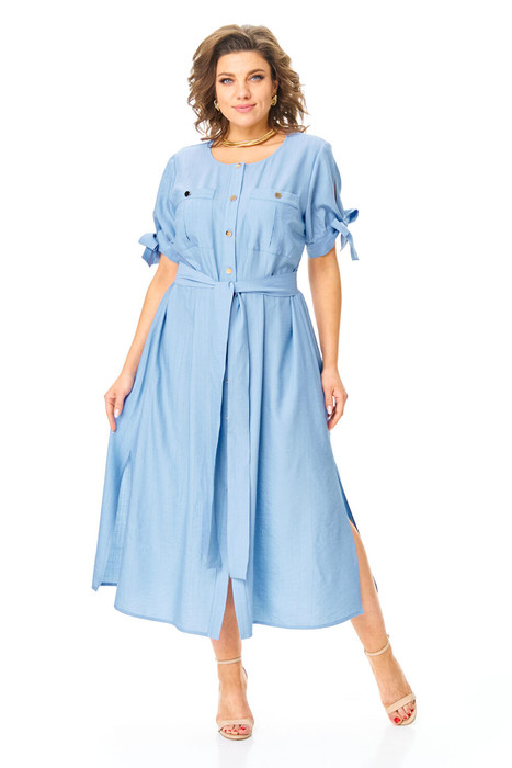 Платье женское свободного покроя с легким расклешением к низу и естественной линией плеча. Рукав втачной с разрезом в верхнем шве и манжетой переходящей в завязки.Горловина округлой формы. Перед с отрезной планкой, застежкой на петли-пуговицы, вытачками переходящими в складку и нагрудными карманами. Спинка с подрезом ниже линии талии, сборкой в нижней части и втачным поясом переходящим в завязки. В боковых швах обработаны карманы.