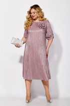 Платье полуприлегающего силуэта с естественной линией плеча с лёгким заужением по низу. Спинка со средним швом, талиевыми вытачками и застежкой на молнию. Перед с нагрудными и талиевыми вытачками. По переду обработана отделочная отрезная планка из полотна с пайетками. Для комфорта и практичности носки в шве притачивания планки переда обработана шлица. Вырез горловины V-образной формы. Рукав втачной одношовный длинный, выполнен из эластичной сетки. Низ рукава обработан манжетой из полотна с пайетками.
