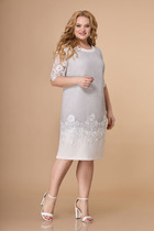 Платье полуприлегающего силуэта с естественной линией плеча с лёгким заужением по низу. Платье выполнено на трикотажной подкладке. Спинка со средним швом, талиевыми вытачками, шлицей и застежкой на молнию. Перед с нагрудными и талиевыми вытачками. По переду и спинке выполнен ассиметричный подрез, разделяющий платье на части контрастного цвета. На подрез по переду настрочено отделочное кружево по верх которого пробиты жемчужные бусины, придающие платью дополнительную изысканность и лёгкий шарм. Вырез горловины округлой формы. Рукав втачной одношовный длиной 3/4.