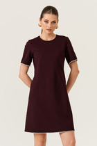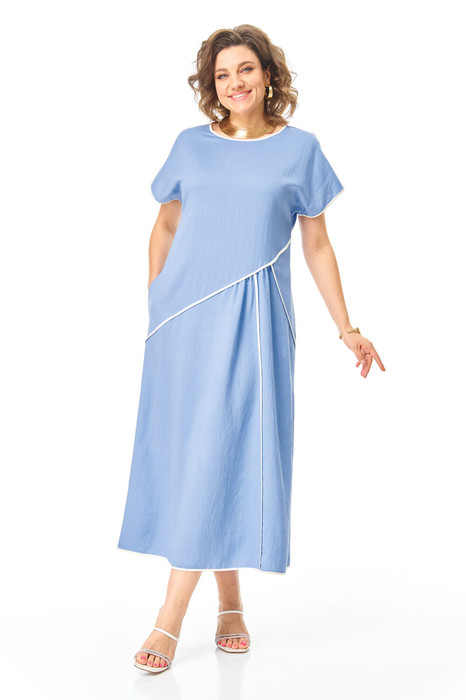 Платье женское А-образного силуэта со спущенной линией плеча. Рукав типа "летучая мышь". Горловина округлой формы. В среднем шве спинки застежка на тесьму-молнию. По переду выполнен ряд ассиметричных подрезов с кантами контрастного цвета и легкая сборка. В боковых швах обработаны карманы. Горловина, низ рукава и платья окантованы тканью контрастного цвета.