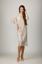 Платье трапециевидного силуэта с дизайнерским цветочным принтом, который создаёт игривое настроение за счёт лёгкости ткани и силуэта модели. Платье с округлой горловиной, нагрудными вытачками, перед и спинка платья на подкладке. Рукав втачной одношовный, длинный со сборкой на венгерку и рюшей. Длина платья от высшей точки плечевого шва до низа 108 см (р 50-54), 109 см (р 56-60). Длина рукава 66 см.