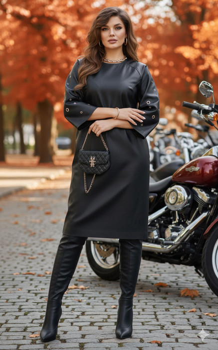 Платье полуприлегающего силуэта с округлой формой горловины. По переду платья нагрудные вытачки. По спинке застёжка на декоративную тесьму молнию в среднем шве платья и разрезом от низа. Рукава становятся главным акцентом: ряд люверсов и кнопок, выстроенных словно доспехи, придают образу дерзкий, почти урбанистический шик. Рукав в платье реглан, расширяется к низу, длиной 7/8. В боковых швах платье карманы. Длина платья 109 см (р 50-54), 111 см (р 56-60). Длина рукава 61 см.