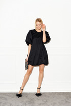 Платье прилегающего силуэта, с округлой формой горловины с ассиметричным подрезом по талии и небольшим напуском. Рукав в платье ассиметричный (левый-цельнокроеный, правый со спущенный проймой через подрез по лифу платья). От подреза притачная баска, юбка платья прямая с разрезом в боковом шве. В боковом шве платья застёжка на тесьму-молнию.Длина платья 135 см. Длина рукава левого 39 см (р.50-54), 40 см (р.56-60). Длина рукава правого 52 см  (р.50-54), 53 см (р.56-60)