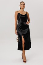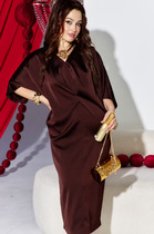 Это платье — олицетворение силы и изящности: ярко, но не кричаще. Уверенный, волнующий наряд для торжественных мероприятий и важных встреч. Силуэт «летучая мышь» мягко обтекает фигуру, создавая плавный переход между линией плеч и линией талии, затем свободно распускается по бокам, позволяя ткани играть волной при каждом движении. Вырез горловины V-образной формы подчёркивает изящную шею, а рукава добавляют образу лёгкую драматичность и женственность. По переду платья средний шов, с застроченной складкой выше уровня талии переходящую в складку по плечу. Спинка в платье со средним швом с разрезом от низа. Рукав в платье цельнокроеный со щеловидным вырезом проймы. Длина платья 123 см, длина рукава 48 см (р 52-56), 48,5 см (р 58-62).