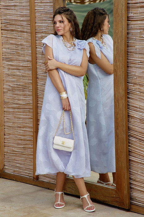 Это платье для тех, кто верит в магию повседневности и умеет находить поэзию в обычных летних днях. Оно создано для мечтательниц, фантазерок и всех, кто помнит, что иногда достаточно надеть правильное платье, чтобы день превратился в сказку. Сиреневый оттенок — это сложная гамма, меняющаяся подобно небу на рассвете: при прямом свете — нежно-лиловый с голубоватым подтоном, в тени — приглушенный фиалковый с сероватым отливом. Полупрозрачный материал, создающий эффект дымки. Ткань пропускает свет, но сохраняет приватность, при движении образует мягкие складки и волны. Фактурный принт — главная особенность ткани, создающая объемную иллюзию. При определенном угле зрения узор "оживает". Платье имеет небольшое прилегание расширяясь к низу. Верхний слой платья по низу закладывается в складки и «заболонивается» на подкладку. Форма баллона создает ощущение воздушности. Горловина в платье имеет ассиметричный фигурный вырез. По переду и спинке платья вертикальные рельефы от плечевых швов до низа, на уровне талии застрачиваясь в неглубокие складки. Линия плеч в платье ассиметричная, пройма углублена. В боковом шве платья застёжка на потайную тесьму-молнию. Съёмная брошь-роза — изысканный акцент, выполненный из той же ткани. Она добавляет в образ романтические нотки. Платье на подкладке. Длина платья 132 см, длина рукава 22/14 см (р 50-54), 22,5/14,5 см (р 56-60).
