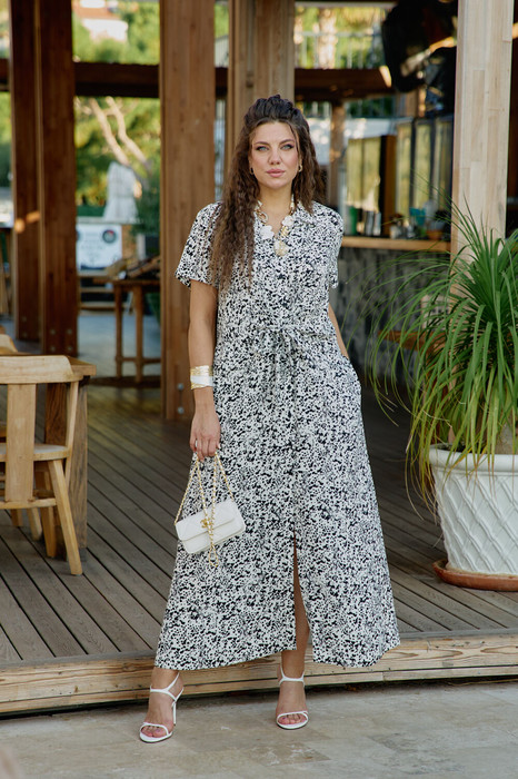 Платье женское летнее для повседневной носки в романтическом стиле небольшого объема полуприлегающего силуэта по геометрическому подобию напоминает трапецию и немного расширяется к низу. Платье распашное, перед выполнен с фигурным подрезом по талии из которого выходят завязки, формирующие на талии драпировку и декоративный узел. Застежка вертикальная на петли и пуговицы на притачной планке. Воротник на стойке рубашечного типа. Плечевой пояс наклонный естественной ширины с плавным переходом в линию рукава. Спинка цельнокроенная. Рукав втачной короткий.  Платье без подкладки из 100% вискозы незаменимо в летнем гардеробе. Уникальный графический принт кокетливо скрывает в себе анималистичный рисунок, незаметный с первого взгляда на платье. Его удобно носить каждый день в жаркий день, а также легко сочетать с жакетом. Благодаря трендовому рисунку платье будет актуально и в последующие сезоны. Его удобно носить на прогулке, встречи, работу. Оно незаменимо в отпуске. Дышащий, натуральный материал создаст ощущение заботы о вашем образе и придаст уверенности в каждом движении. Длина платья 130 см (р 54-58), 131 см (р 60-64).