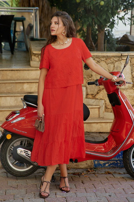 Мы в восторге от данной модели, а Вы? Летнее женское платье в насыщенном алом оттенке из ткани ришелье с тончайшей вышивкой ришелье, и однотонного материала представляет собой настоящее произведение искусства, воплощающее в себе свежесть и жизнерадостность тёплых солнечных дней. Шикарное платье из хлопка - идеально для всех! Украсит любую фигурку и сделает Ваш образ неотразимым! Замысловатый дизайн вышивки ришелье придаёт данной модели роскошный вид. Платье А-силуэта, с округлой горловиной и отлетной деталью лифа из вышитого ришелье, и с нагрудными выточками. Рукав в платье короткий из вышитого ришелье на просвет. Спинка в платье без особенностей. По низу платья идут горизонтальные воланы со сборкой. Главной изюминкой данной модели является мятый эффект по однотонной части платья, что позволяет Вам всегда эффектно выглядеть в этом наряде. Длина платья от высшей точки плечевого шва до низа 125 см . Длина рукава 22 см.