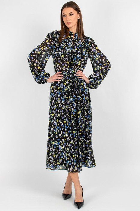 Втачные одношовные рукава с изящной сборкой у оката и эластичными манжетами идеально сидят по фигуре, не стесняя движений. Воротник-стойка придаёт платью строгий, но женственный вид, а завязывающийся пояс позволяет регулировать объём талии, создавая желаемые пропорции.
