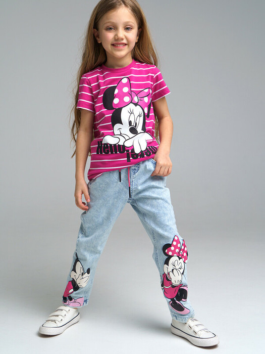 Джинсы с персонажем Disney из сверхудобного эластичного материала Loop Denim. Loop denim имеет внешний вид классической джинсы, а по тактильным ощущениям мягкий и комфортный, как трикотаж. Comfort fit – свободный крой брючин. Эластичный пояс со шнурком. Функциональные карманы.