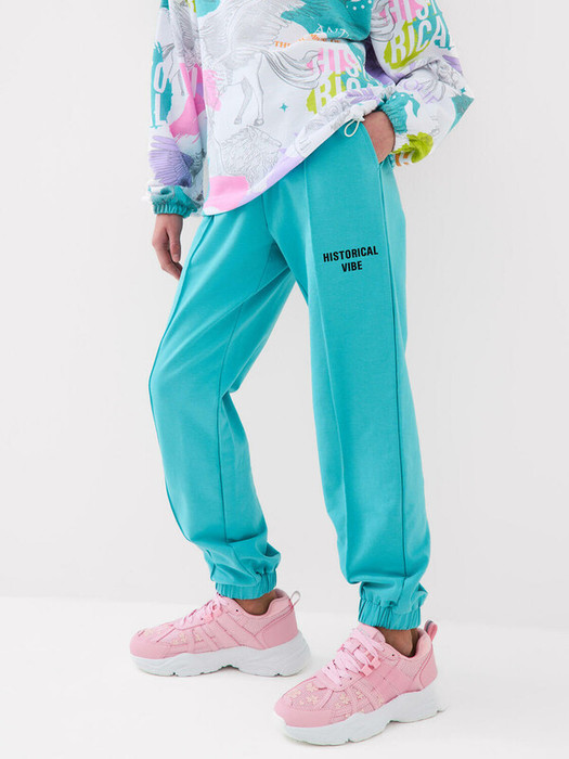Брюки спортивные для девочки подростка. Выполнены из хлопкового трикотажа футер без начеса. Модель прямого кроя со средней посадкой на талии. Пояс на резинке, дополнительно регулируется шнурком. По бокам — удобные карманы. В нижней части брючин предусмотрены эластичные трикотажные манжеты для лучшей посадки.