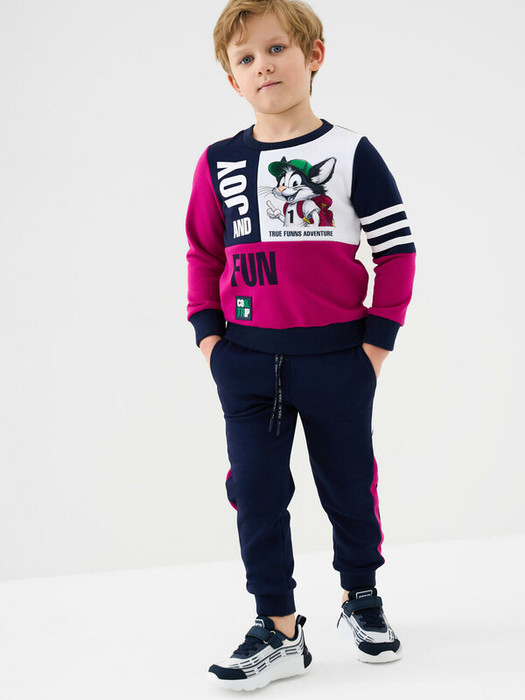 Детский спортивный костюм для мальчика. Комплект выполнен из хлопкового футера и состоит из свитшота и джогеров на резинке. Толстовка прямого кроя с красочным принтом и нашивкой. Манжеты и пояс выполнены из эластичного риба, благодаря чему изделие хорошо держит форму. Брюки джоггеры — комфортные, с эластичным поясом и шнуром для регулировки посадки. Удобные боковые карманы. Низ штанин собран на резинку.