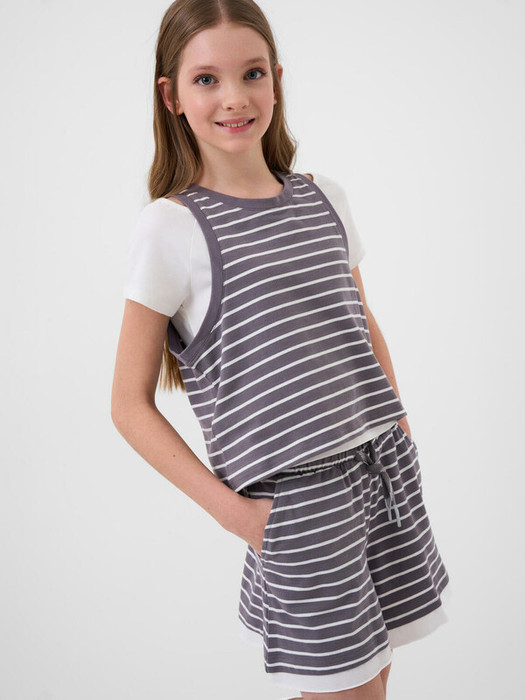 Комплект для девочки подростка. Состоит из футболки с коротким рукавом, майки и шорт. Выполнены из мягкого хлопкового трикотажа джерси. Футболка имеет классический прямой крой, короткие рукава и круглый вырез. Шорты свободные, с удобным поясом на резинке и шнурком для регулировки посадки, дополнены боковыми карманами. На майке и шортах присутствуют небольшие брендированные лейблы.
