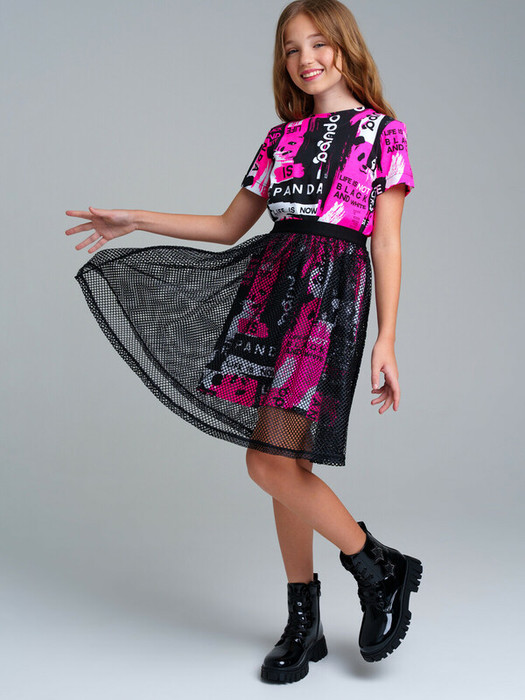 Oversize платье  из качественного и приятного на ощупь трикотажа джерси. Высокое содержание хлопка 95%. Благодаря наличию эластана в составе ткани изделие проще в уходе и держит форму. Юбка из сетки с ластичным поясом по талии.