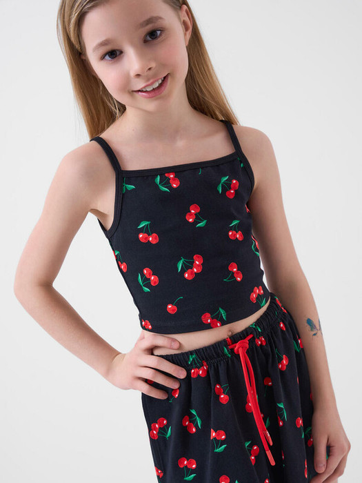 Комплект для девочки подростка. Включает топ и шорты, выполненные из мягкого хлопкового трикотажа с ярким принтом вишен. Топ с тонкими бретелями. Шорты имеют эластичный пояс с завязками для удобной регулировки посадки. Удобные боковые карманы.