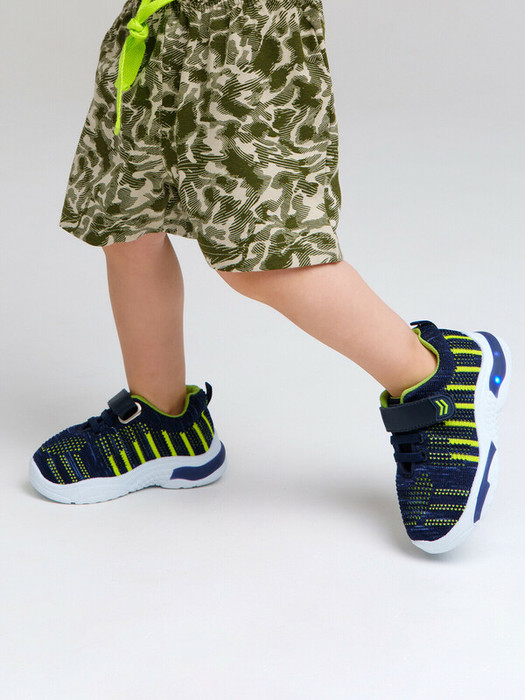 Кроссовки из дышащего текстиля. Кожаная профилированная стелька с анатомической формой обеспечивает правильную нагрузку на стопу. Текстильная подкладка из хлопка обладает высокой гигроскопичностью. Подошва имеет светодиодные элементы. Эластичные шнурки и липучка создают удобство при обувании и надежно фиксируют ногу. Формоустойчивый задник поддерживает стопу в правильном положении. Эргономичная форма колодки обеспечивает правильное формирование стопы ребенка.