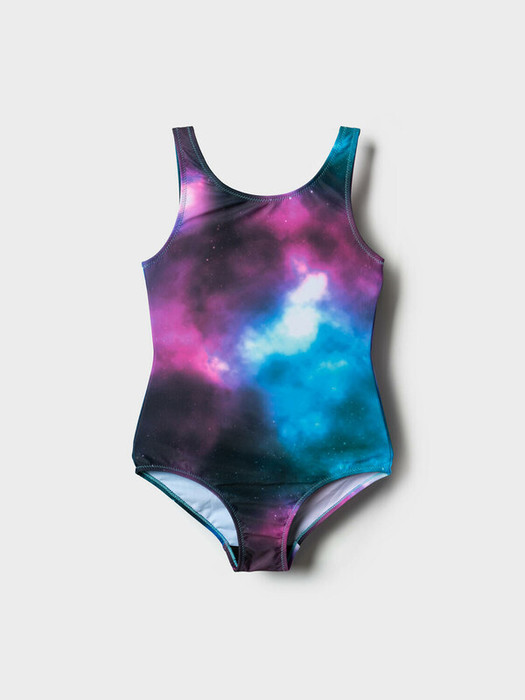 Слитный купальник для девочки подростка. Изделие выполнено в ярком дизайне с космическим принтом. Спереди и сзади — классический округлый вырез. Купальник хорошо облегает фигуру, подходит как для пляжа, так и для бассейна. Внутри передней части — мягкие съемные чашечки и двойная подкладка. Все края обработаны эластичной тесьмой для комфортной посадки. В нижней части — гигиеническая подкладка. Благодаря UF-защите, ткань сохраняет первоначальный вид даже при длительном пребывании на солнце.