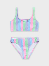 Купальник раздельный для девочки. Верх выполнен в виде топа с крупным декоративным бантом, а спереди и сзади добавлены завязки. Бретели регулируются по длине. Плавки на подкладке украшены воланами по краю и мягкой резинкой на талии и ножках. Все края обработаны эластичной тесьмой, чтобы изделие хорошо сидело на теле и не натирало. Благодаря UF-защите, ткань сохраняет первоначальный вид даже при длительном пребывании на солнце. Подходит для плавания и активного отдыха.