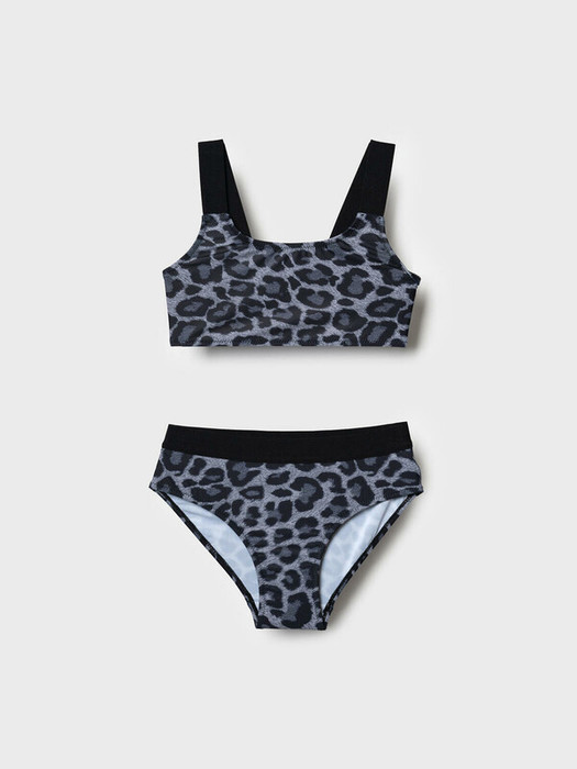 Купальник для девочки подростка. Состоит из укороченного топа и плавок средней посадки. Выполнен из эластичной ткани с леопардовым принтом в чёрно-серой гамме. У топа широкие чёрные бретели. Плавки также с эластичным поясом и внутренней подкладкой для комфорта. Элементы изделия дополнительно усилены эластичной и силиконовой тесьмой для надёжной посадки. Благодаря UF-защите, ткань сохраняет первоначальный вид даже при длительном пребывании на солнце. Подходит для плавания и активного отдыха.