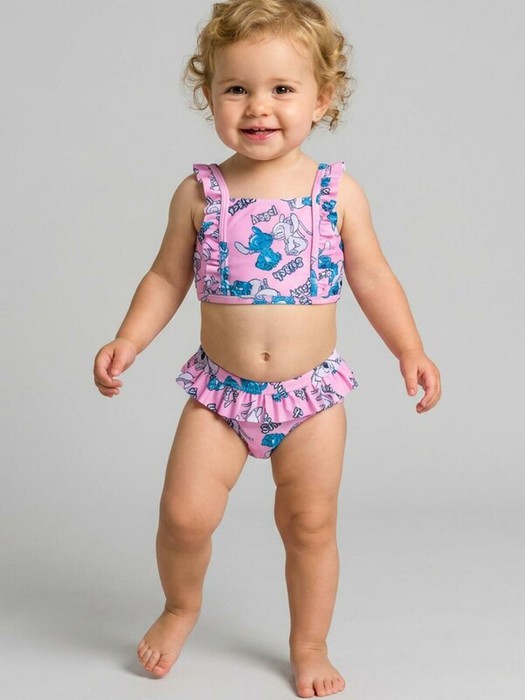 Купальник детский раздельный для девочки. Верхняя часть — укороченный топ с прямым вырезом и очаровательными рюшами на бретелях, которые можно отрегулировать. Плавки с подкладкой и высокой посадкой также украшены рюшами по поясу. Вся поверхность костюма украшена ярким принтом с персонажами Лило и Стич на розовом фоне. Все края обработаны эластичной тесьмой, чтобы изделие хорошо сидело на теле и не натирало. Благодаря UF-защите, ткань сохраняет первоначальный вид даже при длительном пребывании на солнце. Подходит для пляжа и бассейна.