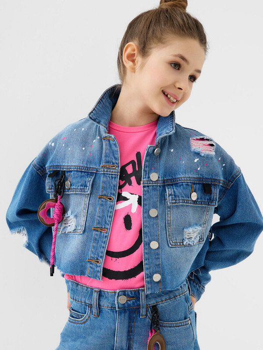 Джинсовая куртка оверсайз для девочки подростка. По всей куртке нанесены яркие розовые и белые брызги. Куртка застегивается на металлические болты, имеет два больших нагрудных кармана, а также удобные боковые карманы. На спинке расположена яркая нашивка с логотипом, а на груди — съёмный декоративный брелок. Низ изделия оформлен необработанным срезом, что придает ему неформальный стиль.