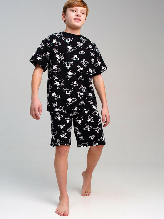 Пижама для мальчика подростка. Футболка и шорты из эластичного и приятного на ощупь трикотажа. Шорты на резинке со шнурком.  Шорты с карманами в боковых швах. Высокое содержание хлопка 95%. Благодаря наличию эластана в составе ткани изделие держит форму и меньше мнется.