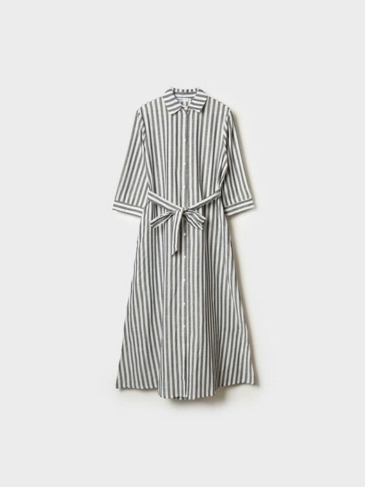 Женское платье в длине макси. Модель выполнена из хлопковой ткани, имеет прямой верх и расширенную к низу юбку, за счёт чего красиво смотрится в движении. Платье застёгивается на пуговицы. Линия талии подчёркивается съёмным поясом. Рукава длинные, с манжетами на пуговицах. По бокам предусмотрены удобные карманы. Воротник классический, отложной.