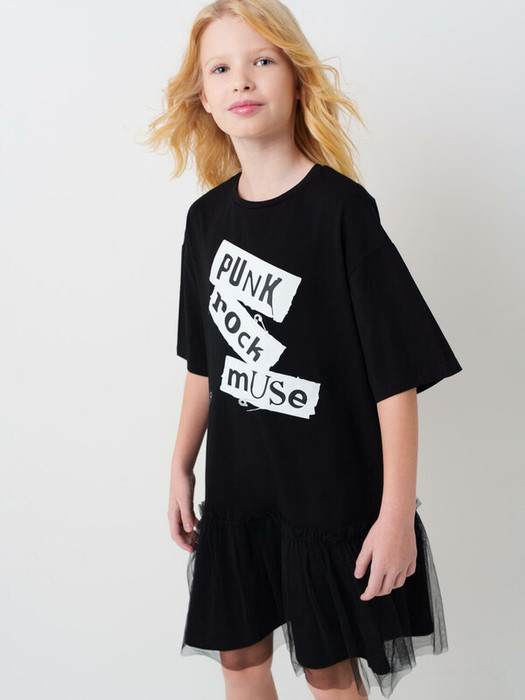 Стильное платье для девочки подростка. Верх выполнен в виде футболки оверсайз с короткими рукавами, а по низу пришита объёмная юбка из чёрной сетки. На груди — яркий принт в стиле панк с надписью и графикой булавок. Горловина круглая, с аккуратной отделкой. Платье выполнено из мягкого хлопкового трикотажа джерси, юбка — из лёгкой сетки. Внутри швы усилены силиконовой лентой для надёжности и комфорта.