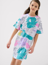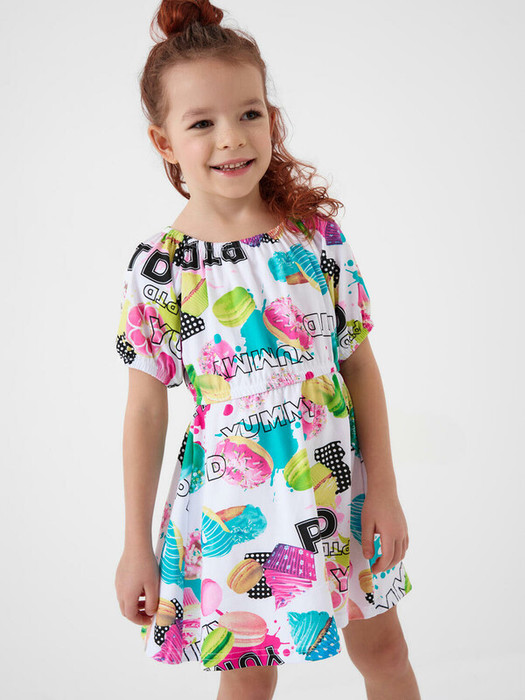Яркое детское платье для девочки. Модель с короткими рукавами выполнено из хлопкового мягкого трикотажа джерси. Оно имеет свободный силуэт, приталено за счёт внутренней резинки на талии, что делает посадку комфортной. Рукава собраны по низу, а горловина аккуратно обработана эластичной резинкой. Платье украшено красочным принтом — с изображением капкейков, конфет, макарунов и ярких надписей. Платье длиной чуть выше колена.