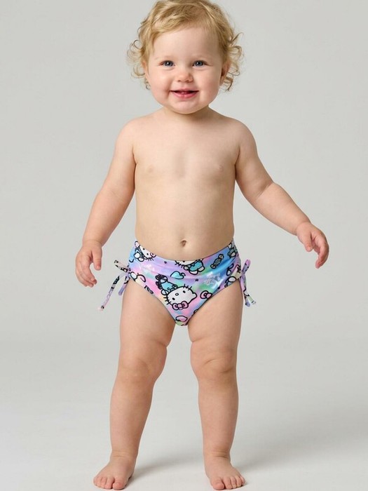 Детские плавки для девочки. Модель выполнена из эластичного трикотажа с принтом Hello Kitty. Украшены боковыми завязками-бантиками. По талии и вырезу ножек вшиты мягкие резинки, чтобы изделие хорошо сидело. Внутри — светлая подкладка. Благодаря UF-защите, ткань сохраняет первоначальный вид даже при длительном пребывании на солнце. Идеально подходят для пляжа или бассейна.