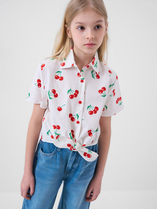 Легкая укороченная рубашка для девочки подростка. Выполнена из хлопковой ткани поплин. Укороченный фасон с короткими рукавами и завязками спереди создает стильный образ. Милый принт с вишнями. Рубашка застегивается на пуговицы и имеет классический воротник. Завязки на талии позволяют регулировать посадку.