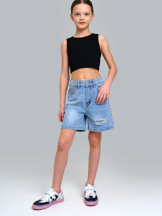 Джинсовые шорты  для девочки подростка. Шорты свободного силуэта. Пояс с внутренней утяжкой. Застежка на молнию и болт. Функциональные карманы. Трендовые элементы потертости и дыры.