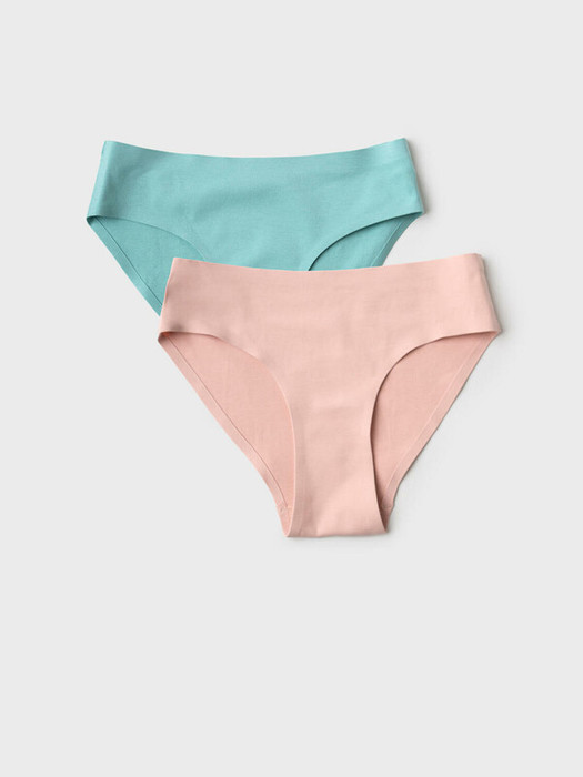 Набор из двух бесшовных трусов-брифов для девочки подростка. Одни трусы выполнены в мягком зелёно-сером цвете, другие — в светло-розовом. Модель имеет аккуратный крой, без резинок и выступающих швов. Ластовица приклеена изнутри и зафиксирована мягкими плоскими швами. Материал - хлопковой трикотаж.