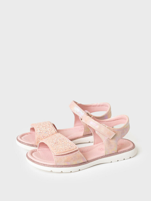 Нарядные розовые сандалии для девочки. Босоножки выполнены из перламутровой искусственной кожи и искусственной кожи с глиттером. Удобные ремни с липучками позволяют регулировать обувь на любой подъем. Подкладка и стелька выполнена из натуральной кожи. Стелька имеет анатомический элемент для поддержания свода стопы в правильном положении. Модель имеет гибкую и легкую подошва из ТПР с противоскользящим протектором.