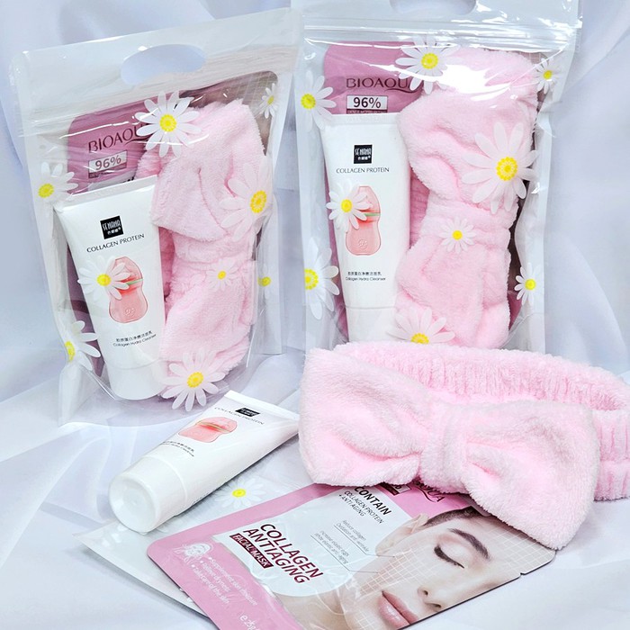 В состав набора входят:, 1. Повязка косметическая бант розовый, 2. Пенка для умывания с коллагеном Senana, 60 гр., 3. Маска для лица с коллагеном, 4. Подарочный Zip-пакет с ромашками