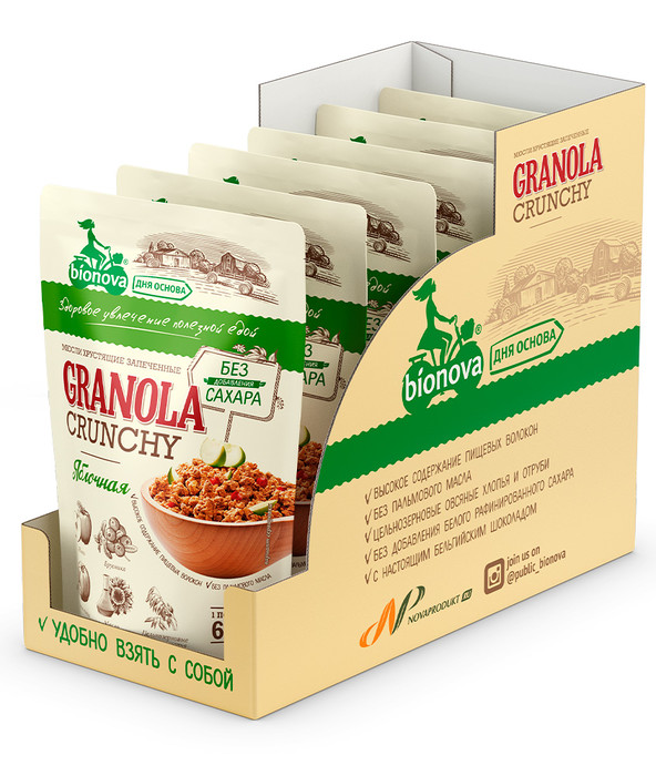 Запеченные хрустящие мюсли (цельнозерновые овсяные хлопья, растительные пищевые волокна, овсяные и пшеничные отруби, пшеничная и рисовая мука, подсолнечное масло, подсластитель натуральный эритрит – из растительного сырья, ячменный солод, соль), семена тыквы, сушеные яблоки и брусника, корица. Содержит подсластитель. При чрезмерном употреблении (более 1 кг в сутки гранолы Bionova) может оказывать слабительное действие. Фрукты, ягоды и зерновые продукты содержат сахара естественного происхождения.