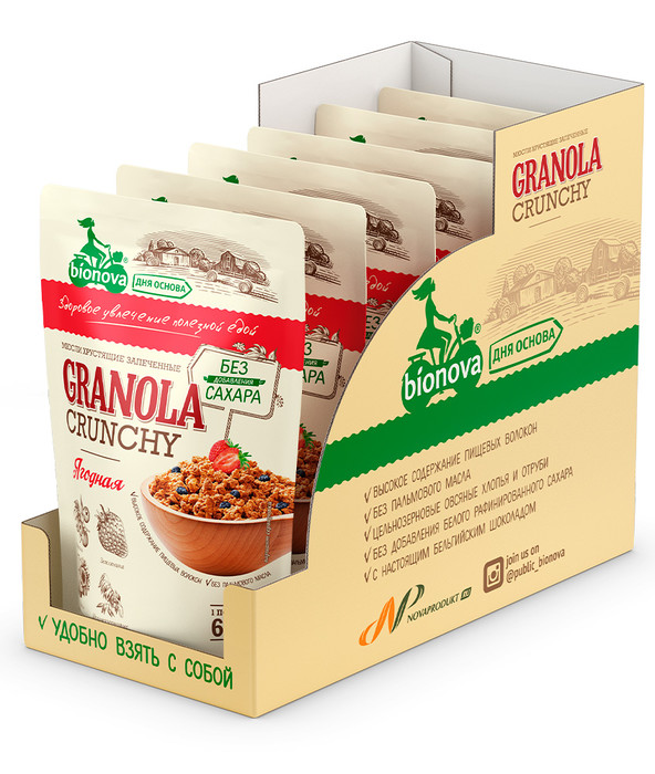 В шоу-боксе 6 порционных гранол Bionova® по 60 г.