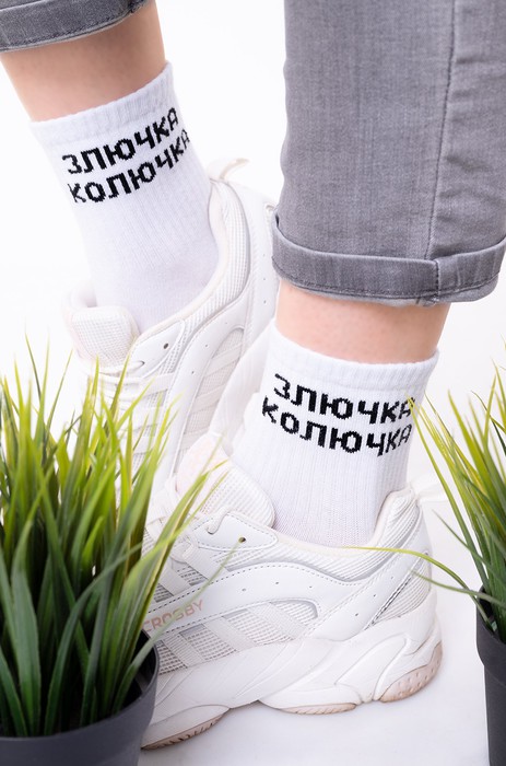 Прикольные женские носки с надписью Злючка колючка – идеальный способ разнообразить быт и добавить в него крутую изюминку! Классный рисунок поднимет настроение и разбавит серые будни. Белые носки для женщин и мужчин выполнены из нежного хлопка, подойдут также для подростков.