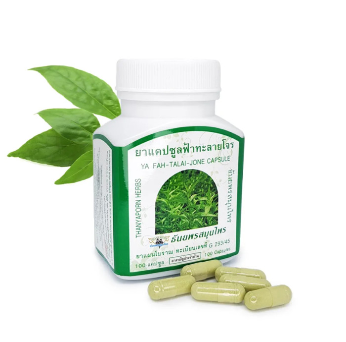 Природный Тайский антибиотик для оздоровления организма, лечения простудных и легочных заболеваний. Применяется при ангине, ОРВИ, ОРЗ, бронхитах, а также для лечения и предупреждения приступов астмы. Основной компонент капсул Фа Талай Джон – Andrographis paniculata (Андрографис метельчатый), производитель популярная в Таиланде компания Thanyaporn Herb.