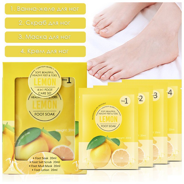 Побалуйте себя спа-процедурой для ног у себя дома! 4-х этапный комплекс по уходу сделает ваши ноги мягкими, красивыми и здоровыми., Лимон известен своими отшелушивающими свойствами, что делает его идеальным средством для смягчения грубой и сухой кожи пяток, делая ваши ноги гладкими и мягкими., В комплект входит:, Способ применения:ШАГ 1: Наполните ванночку для ног теплой водой. Высыпьте в воду желе из пакетика номер 1. Тщательно размешайте до образования желе. Окуните ноги в ванночку на 3-5 мин. Мягко помассируйте ноги, чтобы отшелушить кожу ног.ШАГ 2: Высыпьте в ванночку пакетик номер 2 с солевым скрабом и размешайте. Желе растворится и снова станет жидким. Замочите ноги еще на 3-5 минут в богатой минералами ванночке, позволяя минералам расслабить ваши ноги и кожу. Слейте воду из ванночки для ног.ШАГ 3: Нанесите грязевую маску из пакетика 3 на ступни, пальцы ног и голени. Оставьте грязевую маску питать, успокаивать и расслаблять кожу на 15 мин. Тщательно смойте теплой водой.ШАГ 4: Массирующими движениями нанесите лосьон из пакетика 4 на стопы и голени до полного впитывания.