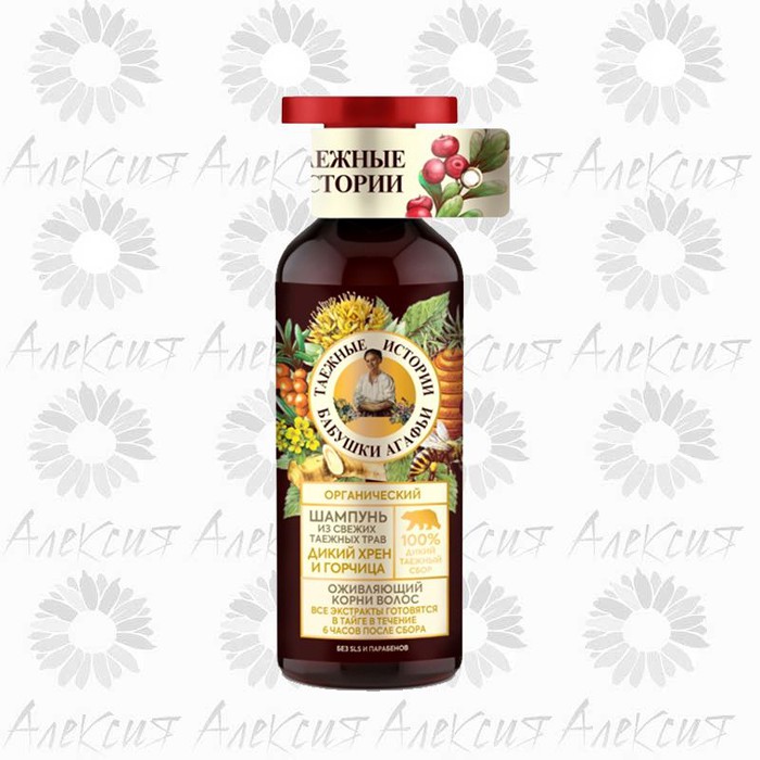 Состав: Aqua with infusions of Organic Cochlearia Armoracia Root Extract (органический экстракт дикого хрена), Organic Sinapis Arvensis Flower Extract (органический экстракт белой горчицы), Organic Saponaria Officinalis Root Extract (органический экстракт мыльного корня), Organic Depuratus Mumijo Extract (органический экстракт алтайского мумиё), Organic Rhodiola Rosea Root Extract (органический экстракт родиолы розовой), Organic Eleutherococcus Senticosus Root Extract (органический экстракт сибирского корня женьшеня), Organic Nepeta Sibirica Extract (органический экстракт котовника сибирского), Organic Chamomilla Recutita Flower Extract (органический экстракт ромашки), Organic Achillea Millefolium Flower Extract (органический экстракт тысячелистника); Sodium Coco-Sulfate, Glycerin, Decyl Glucoside, Cocamidopropyl Betaine, Organic Pinus Sibirica Seed Oil (органическое масло кедра), Sodium Chloride, Coco-Glucoside, Organic Hippophae Rhamnoides Fruit Oil (органическое масло таежной облепихи), Guar Hydroxypropyltrimonium Chloride, Citric Acid, Benzyl Alcohol, Benzoic Acid, Sorbic Acid, Aroma (натуральный ароматизатор горчицы и полыни), Caramel.