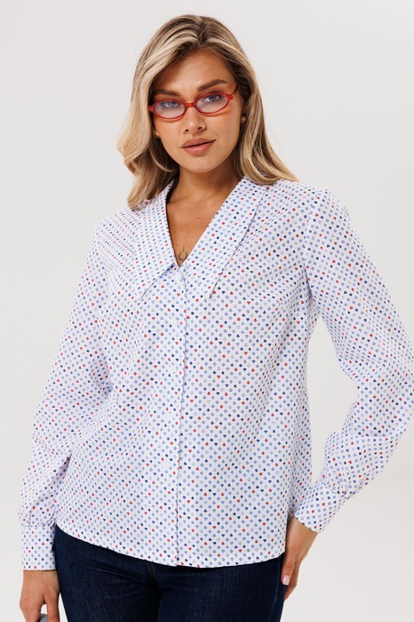 Выполнена из высококачественного хлопка, украшенного интеллектуальным и игривым принтом, вдохновленным изысканными карточными мастями. Главной же особенностью, задающей тон всему силуэту, является актуальный удлиненный воротник, который ниспадает изящными линиями, создавая современный и утонченный акцент.