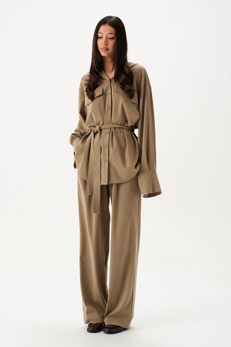 Рубашка прямого свободного кроя, выполнена из текстильного полотна цвета хаки. Характеристика: двойной капюшон, застёжка центральная на пуговицы, по переду на уровне линии груди функциональные карманы с клапаном, рукав свободный спущенный с широкой манжетой на 2 пуговицы, на поясе. Длина рукава 60 см. Длина спинки от края горловины 75 см.